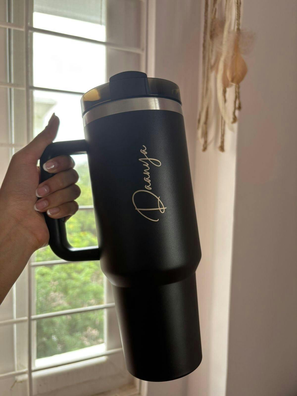 Add your name or a custom message to make it uniquely yours. Whether you’re at your desk, on campus, on the move, or unwinding at home, this tumbler is your daily hydration hype girl.